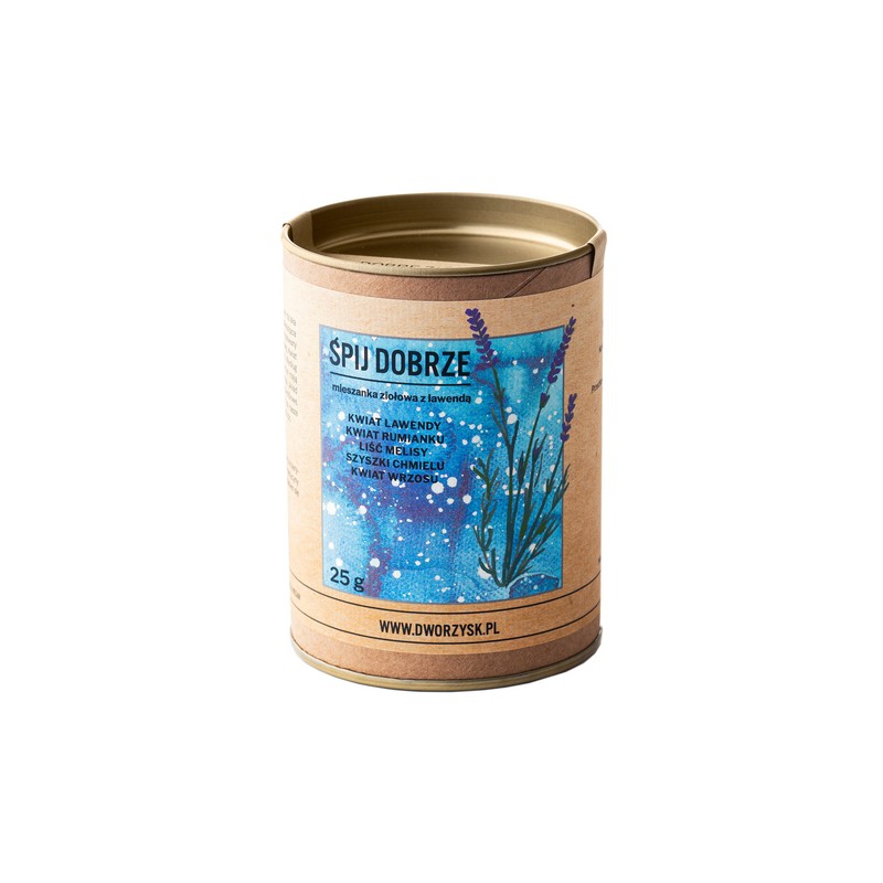Dworzysk Śpij Dobrze is a herbal infusion for a good sleep . It can be used to prepare hot infusion or bath decoction. According to folk medicine, lavender, chamomile, lemon balm, hops and heather have calming and relaxing properties. These herbs regulate the nervous and digestive systems. Lavender is recommended for anxiety states. Chamomile has a soothing and diastolic effect. Lemon balm has calming and strengthening properties. Hops extract is used in states of increased tension and nervous hyperactivity. Heather flowers are helpful for problems with insomnia. It is a good infusion to drink before going to bed. It has a positive effect on our well-being, helps us relax and sleep through the night.
