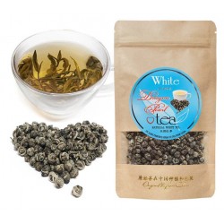 Chinese white tea is hand-rolled into small, pearl-sized balls, which includes tips and the first two leaves. Tips is the first leaf of a branch, a bud in the form of a sprout is a leaf bud. This is the most valuable and expensive part of the Camellia sinensis tea tree. Only tipsy contain the amino acid L-theanine, which helps maintain normal mental function. Teas containing tips contain more antioxidants and less caffeine. White tea is the most delicate and valuable among the Camellia Sinensis tea tree teas. White tea "Dragon Pearl" has a refined aroma filled with notes of flowers and fruits, an exquisite delicate sweet taste.