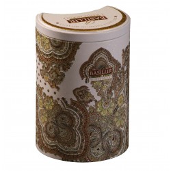 100g loose/leafy tea packed into a foil pouch with zipper lock and then into a beautifully crafted metal tin designed by Basilur.