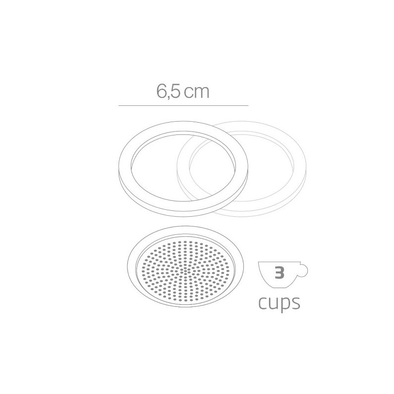 Set consisting of 1 spare filter in aluminum and 2 silicone gaskets, suitable for the following moka-pots: