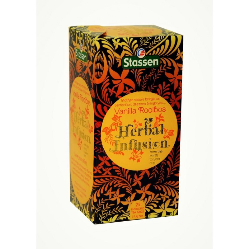 Stassen vanilla Rooibos tea, 25 packets, 37.5g. Ingredients: Rooibos and vanilla flavoring. Preparation: mix 1 tea bag with 150 ml of 99°C t water, let it steep for 2-3 min. Made and packed in Ceylon, Sri Lanka.