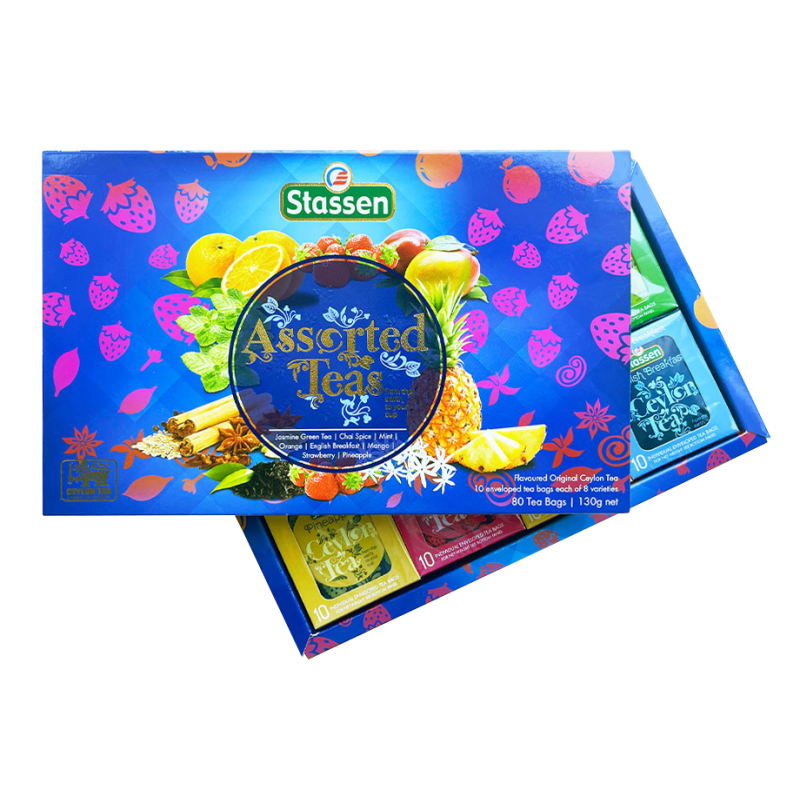 80 enveloped tea bags in a pack.Stassen Tea Assortment pack consists of Jasmine, Chai Spice, Mint, Orange, English Breakfast, Mango , Strawberry and Pineapple tea variants in one assorted pack.