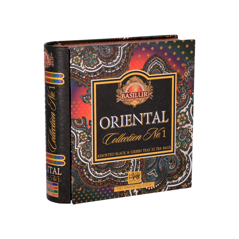 Assorted black and green tea bags in a book shaped gift box: Ceylon black tea with strawberry, apricot, pineapple and papaya aroma / Ceylon green tea with natural mint and Moroccan mint flavour / Ceylon black tea, no additives / Ceylon black tea with natural spices (cardamom, clove, cinnamon, ginger, nutmeg and pepper).