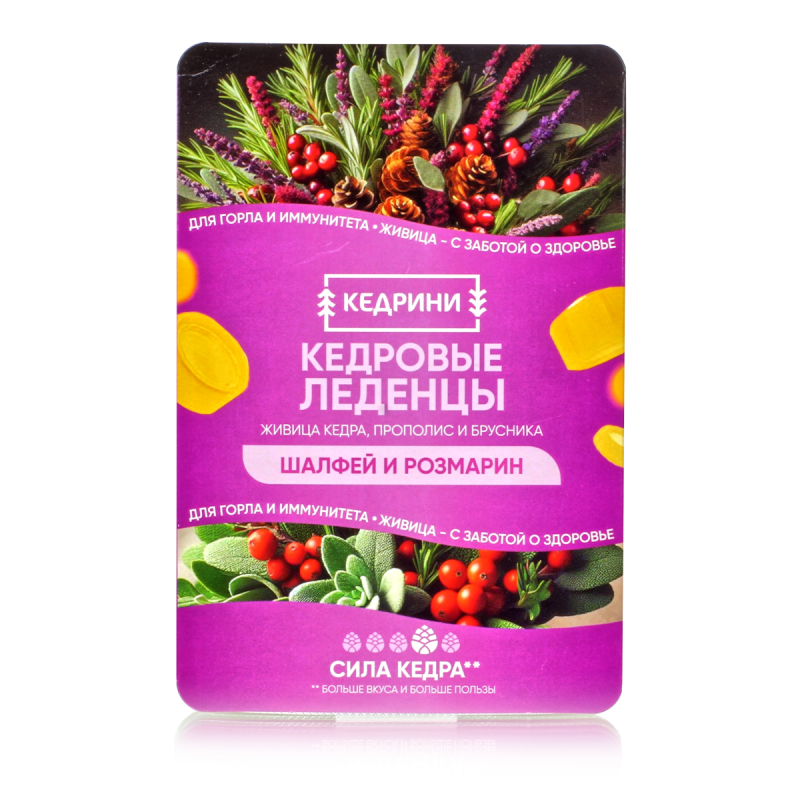 Sugar, starch molasses, cedar oil, cedar resin, propolis, sage extract, acidity regulator: citric acid, ascorbic acid, lingonberry plant extract, rosemary plant extract, natural flavor: sage oil