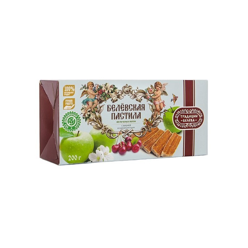 Belevskaya pastila is made mainly from Antonov apples, egg whites and sugar. The apples are baked in the oven on birch logs, the pulp is separated from the peel and core and rubbed through a sieve. The resulting apple puree is mixed with egg whites and sugar, laid out on baking sheets in thin layers and dried in the oven for a long time. The resulting layers of pastila are combined into puff "loaves" using the remaining unbaked puree, cut to shape and sprinkled with powdered sugar.
