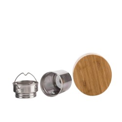 Bottle: double-walled tempered glass. Dishwasher safe. Cap: seasoned bamboo, PP, silicone, stainless steel. Dishwasher safe. Infuser: stainless steel.