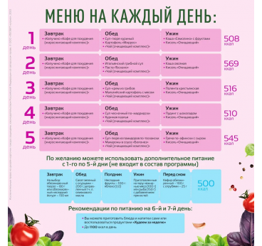 The program menu is designed for a week and includes 32 servings of a variety of dishes and drinks for breakfast, lunch, afternoon tea, and dinner. All the ingredients are easy to prepare, require no cooking, and are ideal for those leading an active lifestyle.