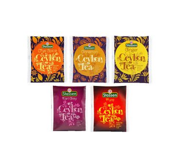 Ingredients: PURE CEYLON CHAI TEA - Ceylon black tea (60%), chai mix (40%). PURE CEYLON CINNAMON TEA - Ceylon black tea (70%), cinnamon (30%). PURE CEYLON GIGNER TEA - Ceylon black tea (70%), ginger (30%). PURE CEYLON EARL GREY TEA - Ceylon black tea (98%), granulated bergamot flavor (2%). PURE CEYLON BLACK TEA - Ceylon black tea (100%).