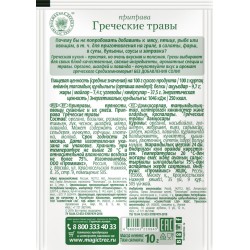Grieķu garšaugi ir piemēroti Vidusjūras reģiona ēdieniem, dārzeņu ēdieniem, mājputniem un gaļai. Viņi arī atklās "slēgto pīrāgu" un citu konditorejas izstrādājumu garšu. Rūpīgi izvēlētas izejvielas garantē produkta kvalitāti. Kompozīcijā ir lavanda - karaliskais augs, tā smalkā smarža atgādina grieķu virtuvi.