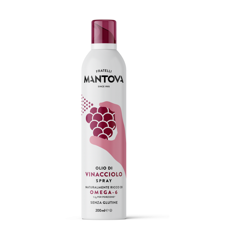 Mantova vīnogu kauliņu eļļas aerosols ir bez ĢMO, nesatur lipekli, holesterīnu un ir pilns ar jaudīgām omega, vitamīniem un minerālvielām; lieliski piemērots pievienošanai katrai ēdienreizei. Lai iegūtu skaistu izskatu un lielisku garšu, nav jājūtas kautrīgi, izsmidzinot gatavus ēdienus. Mantova izsmidzināmās pudeles sniedz jūsu ēdienos visus valriekstu veselīgos ieguvumus — tieši vajadzīgajos daudzumos jūsu iecienītajām receptēm.