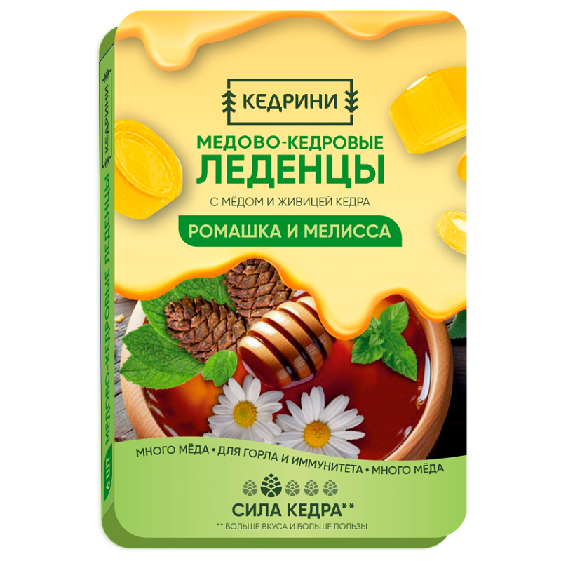 Sastāvs: Cukurs, cietes sīrups, dabīgais medus, ciedra eļļa, ciedra sveķi, skābuma regulētājs citronskābe, sausais kumelīšu ziedu ekstrakts, sausā citrona balzama ekstrakts. Uzturvērtība un enerģētiskā vērtība uz 100 g: Ogļhidrāti - 97 g, 378 kcal/1582 kJ.