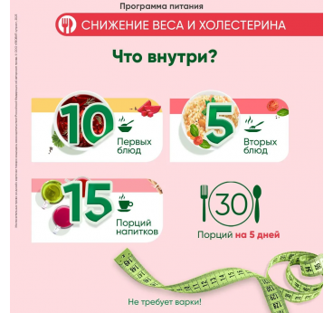 Piegādes nosacījumiSvara un holesterīna samazināšanas uztura programma Mazkaloriju 5 dienu uztura programma. 2 nedēļu laikā samazina svaru vidēji par 3,4 kg. Normalizē kuņģa-zarnu trakta darbību, izvada no organisma vielmaiņas produktus. Paātrina vielmaiņu. Veido veselīgus ēšanas paradumus.