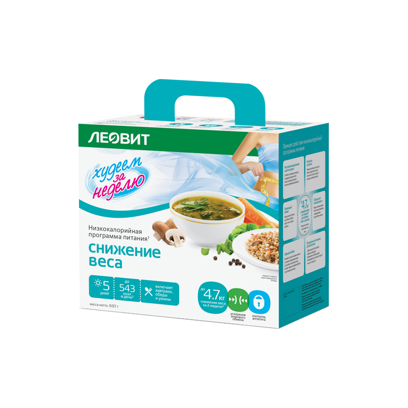 Mazkaloriju uztura programma "Svara zudums" 5 dienu mazkaloriju diētas programma Samazina svaru vidēji par 4,7 kg 2 nedēļu laikā1 Normalizē kuņģa-zarnu trakta darbību, izvada no organisma vielmaiņas produktus Paātrina vielmaiņu Veido veselīgus ēšanas paradumus Uztura programma “Svara zudums” paredzēta 5 darba dienām. Ietver ātri pagatavojamas maltītes brokastīs, pusdienās, vakariņās un uzkodās, kā arī mūsu ieteikumus papildu uzturam (šim nolūkam varat izmantot pašizgatavojamās maltītes vai LEOVIT produktus. Sniedzam arī ieteikumus, ko ēst 6. un 7. dienā.