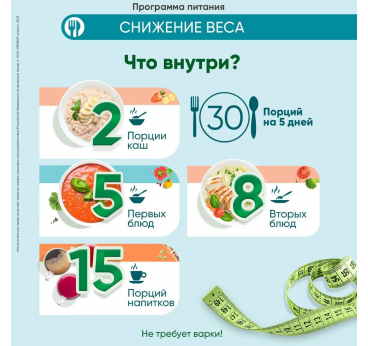 Dzērieni: Ķīselis "Attīrošs", Kafija svara zaudēšanai (tauku dedzināšanas komplekss)" ar zaļo kafiju 2 porcijas, Tēja (tauku dedzināšanas komplekss)" 5 porcijas. Pamatēdieni: Polenta zemnieku 1 porcija, Vistas Paella 1 porcija, Makaroni "Toscano" 1 porcija, Rīsi ar sēnēm un dārzeņiem 1 porcija, Biezputra ar sēnēm un dārzeņiem 1 porcija, Kartupeļi ar zeltainajiem sīpoliem 1 porcija, Pikantās nūdeles ar dārzeņiem 1 porcija, Kartupeļi ar vistu 1 porcija.