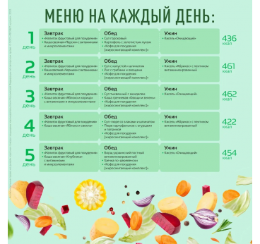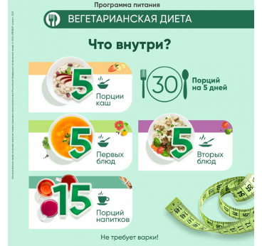 Uztura programma “Veģetārā ēdienkarte” ir efektīva diēta tiem, kas ievēro veģetāro diētu, un tiem, kas vēlas zaudēt svaru. Programma ir paredzēta 5 dienu darba nedēļai. Iekļautas ātri pagatavojamas maltītes brokastīm, pusdienām un vakariņām. Ja vēlaties, varat izmantot papildu uzturu ar kaloriju saturu ne vairāk kā 500 kcal dienā.