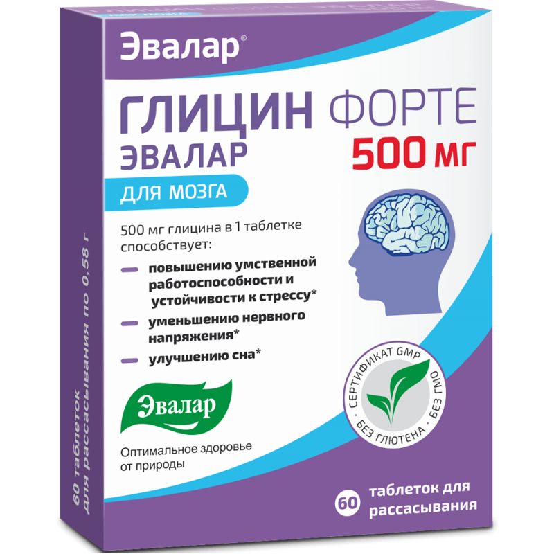 Augsta deva. Parastās glicīna tabletes satur 100 mg aktīvās vielas, tāpēc, lai sasniegtu terapeitisko efektu, jālieto vairākas tabletes dienā. Uztura bagātinātājs "Glycine Forte Evalar" satur 500 mg aminoskābes, tāpēc tas var aizstāt piecas parastā glicīna tabletes.