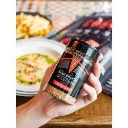 Sastāvdaļas: galda sāls, ķiploki, malti sarkanie saldie pipari, koriandrs, hmeli-suneli.