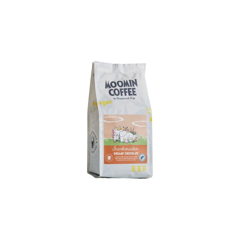 Muumiņu kafija "Snorkmaiden" ir malta, aromatizēta 100% Arabica kafija no Brazīlijas, Kolumbijas, Peru un Indonēzijas. Vidēji grauzdēta, ideāli piemērota espresso pagatavošanai. Jūs varat sagaidīt izteiktas šokolādes notis.