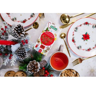 Iepakotie tējas maisiņi ir ievietoti skaisti dekorētā kartona kastītē. Dizaineru komanda rūpīgi izstrādāja katru rotājumu, lai atspoguļotu sildošo saturu.