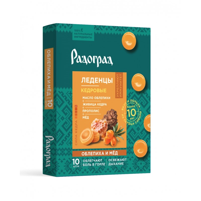 Живичные леденцы «Радоград» с облепихой и мёдом имеют в составе исключительно натуральные ингредиенты: живицу кедра, кедровое масло, прополис, облепиховое масло, витамин С. Они помогут справиться с первыми признаками простуды, поддержат иммунитет, устранят боль и першение в горле. В упаковке – 10 леденцов «Радоград» с облепихой и мёдом на сахаре в блистере.