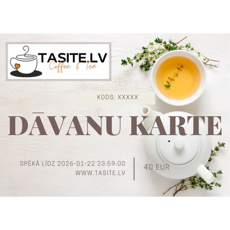 Подарочная карта на сумму 40 евро, которую можно потратить в нашем интернет-магазине в течение года с момента покупки карты. После оплаты Вам на емайл вышлем подарочную карту в PDF формате с действииельным кодом, которым можно воспользоваться при оформлении заказа tasite.lv
