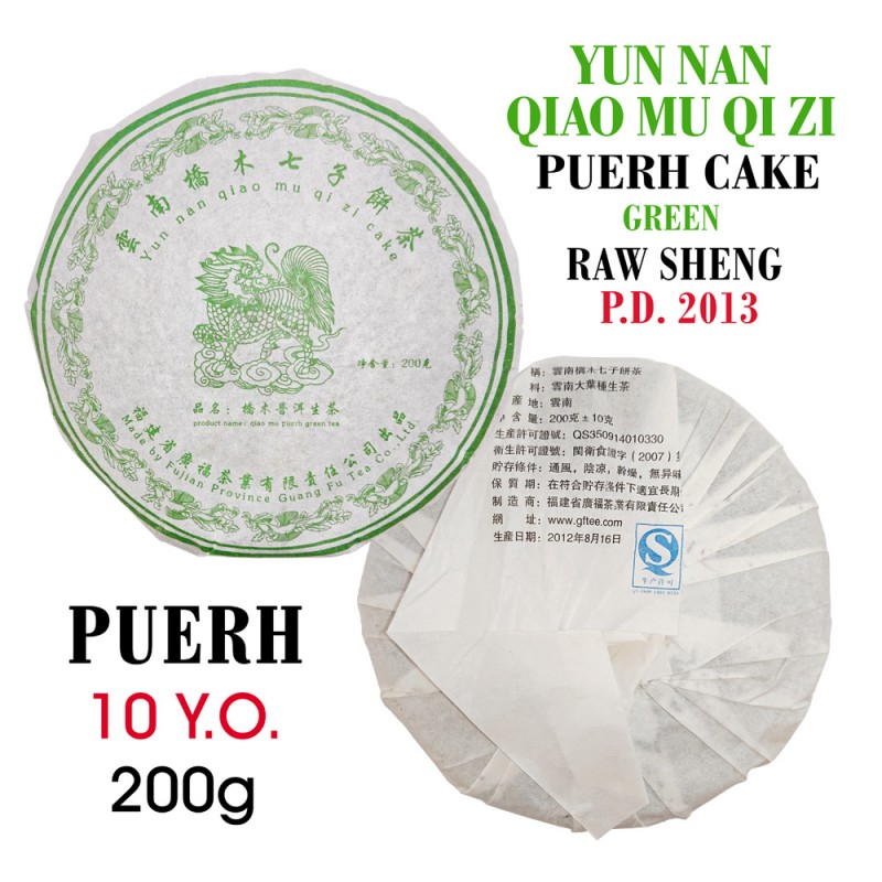 Raw (cырой) шэн пуэр - это зеленый чай, который подвергается сушке на 20% меньше, чем обычный зеленый чай. Его происхождение можно проследить 2000 лет назад. Процесс созревания происходит по традиционному методу, естественным путем, медленной ферментизацийи. Ценность зеленого чая Пуэр начинается с выдержки 10 и более лет. Шэн (зеленый) Пуэр содержит больше антиоксидантов, чем Шу (черный). По вкусу он будет мягче и изысканнее, ближе к зеленому чаю. Интенсивность вкуса и аромата меняется в зависимости от периода выдержки чая (лет Y.О.).
