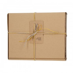 Изделия упакованы в картонную коробку серого цвета, наполненную бумажным наполнителем и перевязанную натуральной бечевкой.