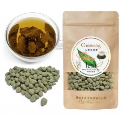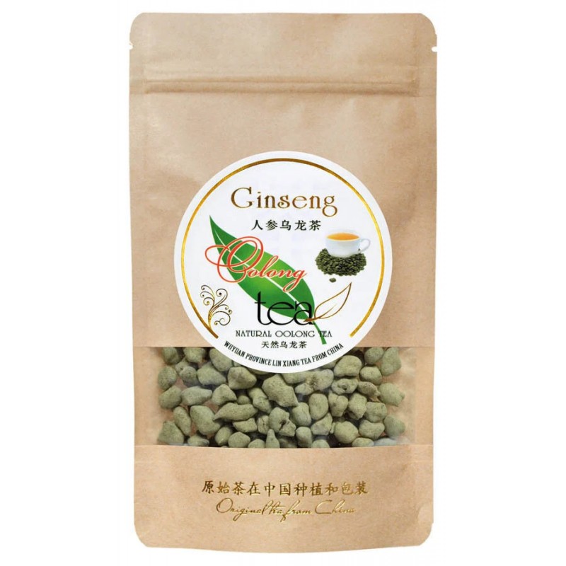 Рецепт чая Улун с женьшенем восходит к временам древнего Kитайского императора. Уникальное отличие от других чаев - это измельченный порошок корня женьшеня, в который скрученные чайные листья Улуна. Этот чайный напиток обладает свойствами чая Улун и корня женьшеня. Применяется только тогда, когда нужен тонус и энергия. Из за свои свойства чай получил название «Утреннея нежная атомная бомба». Секрет тонуса и энергии будет скрываться в первом настое, который будет иметь сладковатый вкус на основе порошка женьшеня, растворяющегося в воде. У чая имеется чистый янтарный оттенок со сладким (первый настой), слегка немного вяжущимся вкусом и легким фруктовым послевкусием.