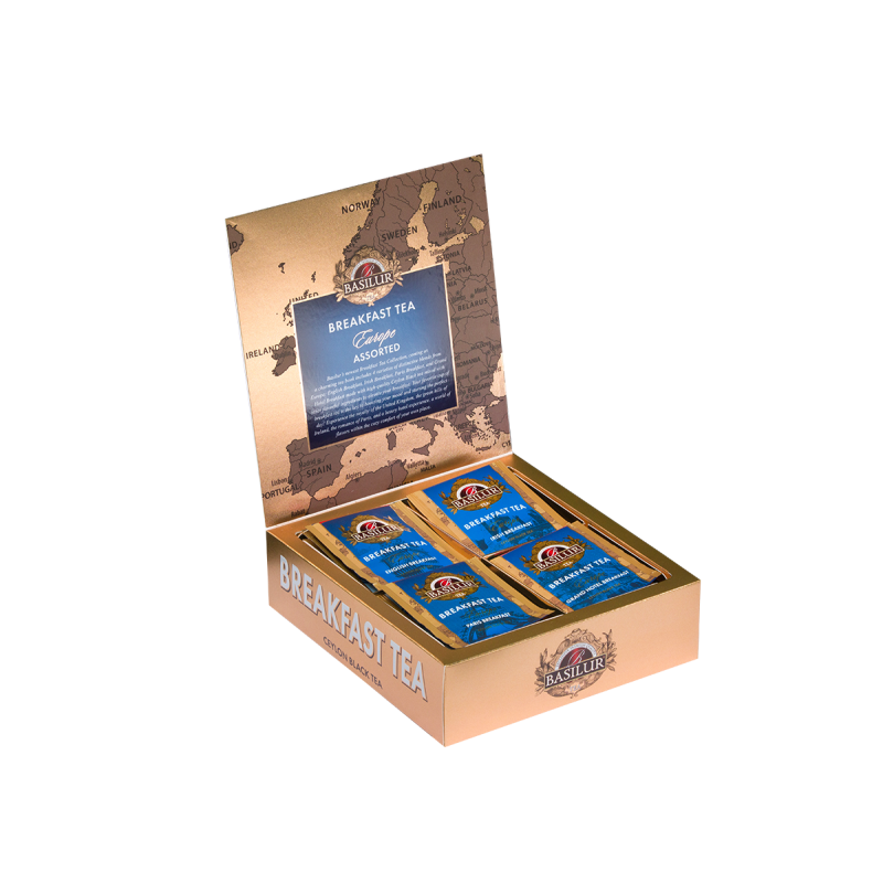 Отправьтесь в путешествие по Европе и попробуйте черный чай Paris Breakfast с романтической розой и бергамотом, настоящий крепкий цейлонский ирландский и английский чай с капелькой молока и Grand Hotel со вкусом шоколада.