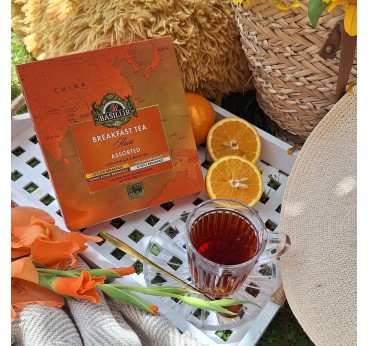Ингредиенты: ЦЕЙЛОНСКИЙ ЗАВТРАК - черный чай, ГОНКОНГСКИЙ ЗАВТРАК - черный чай, КИОТСКИЙ ЗАВТРАК - белый чай, ароматизатор (вишня), ИНДИЙСКИЙ ЗАВТРАК - черный чай 80%, корица 8%, имбирь 4%, гвоздика 2%, мускатный орех 2%, перец черный 1,5%, анис 1%, кардамон 0,5%, натуральный ароматизатор (чай)