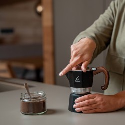 Мока аппарат для эспрессо Radica из алюминия, пригодного для пищевых продуктов, снаружи окрашен в черный цвет. Ручка крышки и ручка с имитацией корня дерева создают впечатляющий вид. Radica сочетает в себе глубоко укоренившуюся кофейную культуру и потребность в изысканных вкусовых ощущениях.