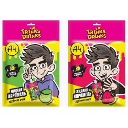 Жидкая карамель во флоупаке с крышкой с ободком очков, пластиковыми трубочками для потребления карамели, насадкой на флоупак, пластиковым носом и резиночкой. Трубочки протягиваются через ободок и приобретают форму очков. К ободку привязывается резиночка , для того чтобы "очки" держались на голове. Трубочка вставлется в насадку и прикручивается к флоупаку вместо крышки. Ободок и нос светится в темноте.
