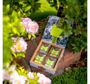 Ассорти чая в пакетиках: ЛАВАНДА — зеленый чай другого происхождения с цветками лаванды, бергамотом и натуральными ароматизаторами лаванды / ЛИМОН — зеленый чай другого происхождения с ароматизаторами лимона и бергамота / МАНДАРИН — зеленый чай другого происхождения с ароматизаторами мандарина и бергамота / МЯТА — зеленый чай другого происхождения с мятой и бергамотом и ароматизаторами мяты.